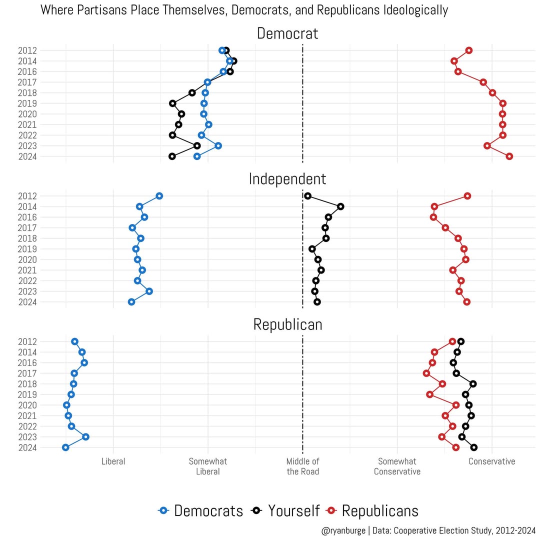 Partisan politics by Party members stating where they place themselves on the spectrum. No surprise independents are in the middle with a slight lean conservative, the GOP thinks they are more radical conservatives. Likewise, Republicans think Democrats are radical left while Dems themselves think they are just somewhat liberal. What this really shows is that the farthest left and right pundits have the loudest voices. Source: facebook